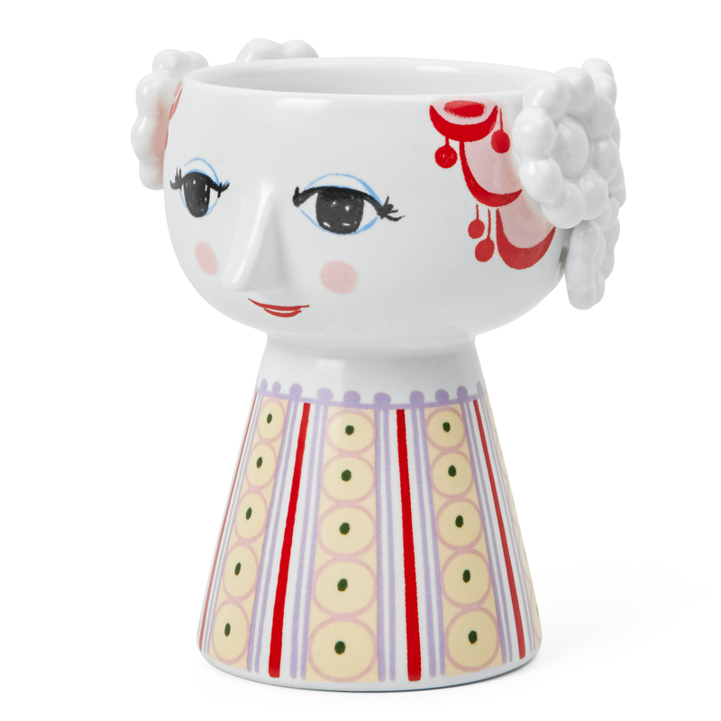 Opdag det legende og kunstneriske univers med denne Eva lysestage fra Bjørn Wiinblad, udført i en smuk lavendel nuance med signaturrødkindet ansigt og farverige mønstre. Lysestagen er 9,5 cm høj, har en diameter på 8 cm og dybde på 7,5 cm. Fremstillet i blankglaseret keramik og designet til både fyrfadslys og små stearinlys – eller som et dekorativt kunstobjekt i sig selv. Med sit unikke formsprog og sprudlende farver tilføjer den sjæl, glæde og stil til ethvert hjem.