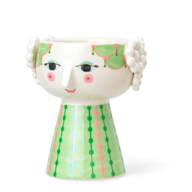 Den charmerende Eva-lysestage fra Bjørn Wiinblad byder på kunstnerisk design og hyggelig stemning. Udført i blankglaseret keramik i en frisk lysegrøn nuance, og med det karakteristiske ansigt og kegleform, som kendetegner Wiinblads stil. Højden er 9,5 cm, hvilket gør stagen velegnet til både borddækning, vindueskarme og som dekorativ detalje i hjemmet. Serien kombinerer humor, elegance og nordiske former – en gaveidé eller designdetalje med sjæl.