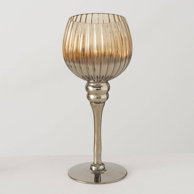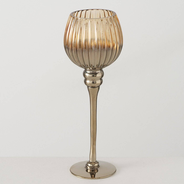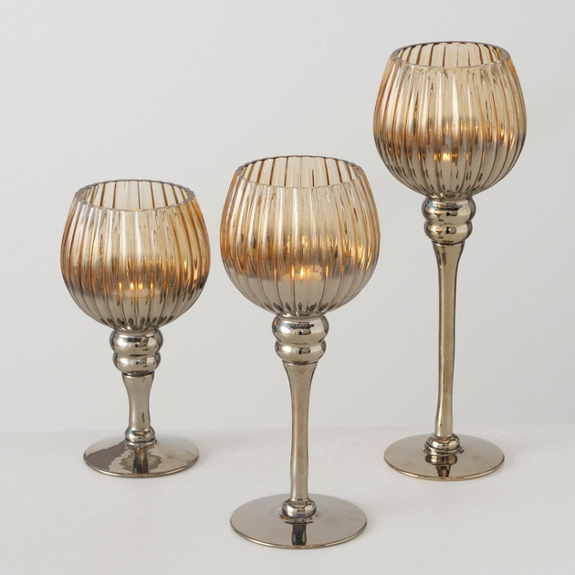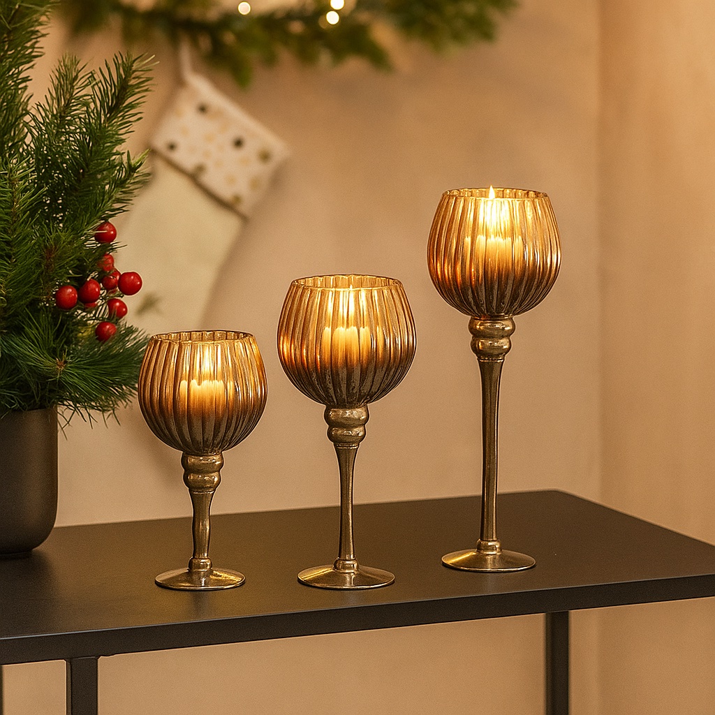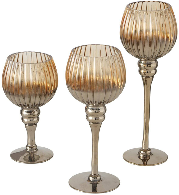 Sæt med 3 håndlavede fyrfadsstager i gyldent glas med blank overflade. Højder 20–30 cm og diameter 10 cm – elegant dekoration til ethvert rum.