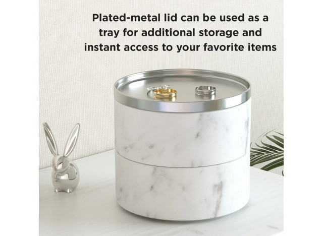 Denne to delte smykkeboks er både smuk og kompakt. TESORAs låg fungerer som en bakke til opbevaring af ringe eller andre små ting og har to skåle, der kan stables eller adskilles for at sortere og beskytte smykker.