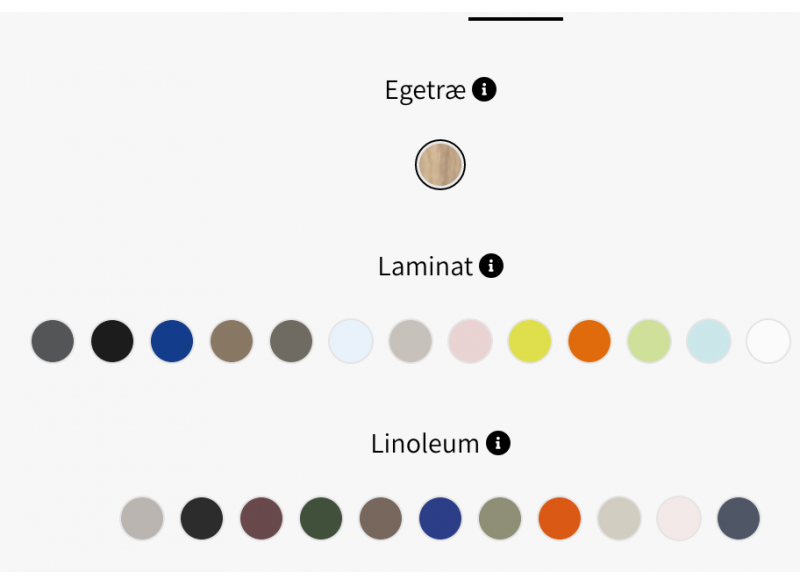 Front i massivt egetræ, 14 forskellige laminat farver eller 11 forskellige linoleum faver. Kig ind i butikken og se farveprøverne.