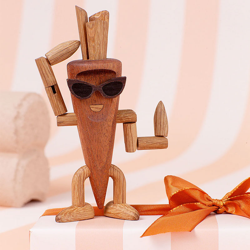 Meet Camille Carrot, the playful and humorous wooden figure from Woodies, bringing fun and personality into everyday life. Despite her French-sounding name, her roots are firmly planted in Danish soil, and she’s now ready for new adventures with a twinkle in her eye and stylish retro sunglasses. Camille is proud of her origins, combining a love of the garden with quirky moves – like the other Woodies, she has mastered dapping and spreading joy in your home.