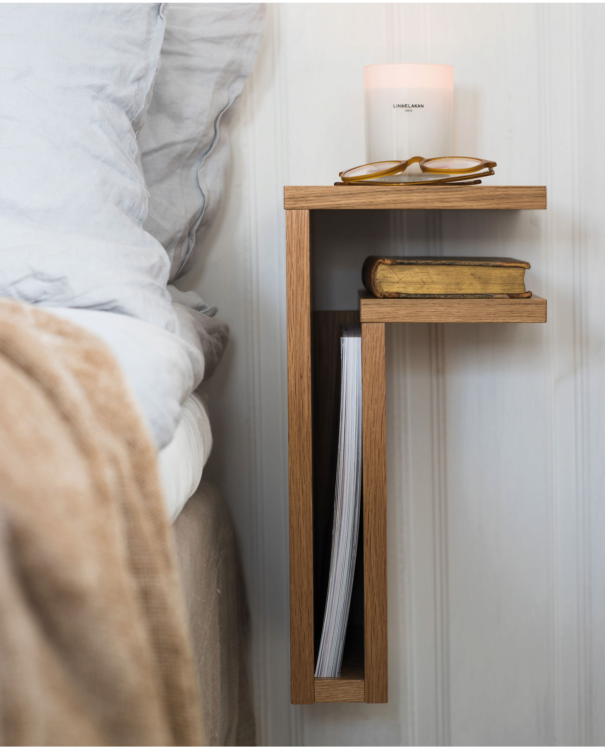 Elegant væghylde i egetræsfiner designet til at give funktion og stil i rum med begrænset plads – perfekt som sengebord, ved sofaen eller i hjørnet.