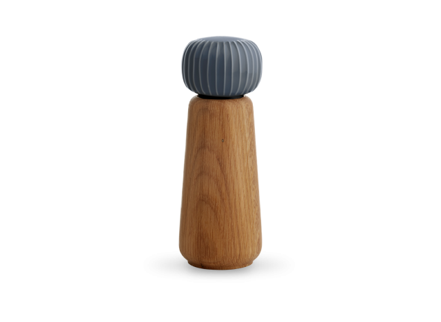 Lækre kværne i smukt egetræ. Hovedets dekorative riller sørger for, at salt/peber-kværnen er god at holde om og nem at åbne. Denne lækre marmorgrå glasur passer perfekt med de andre salt/peber-kværne i Hammershøi-serien. Ikke nok med at de ser super flotte ud i dit køkken, de tager sig også flot ud på middagsbordet.