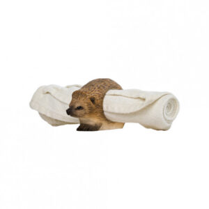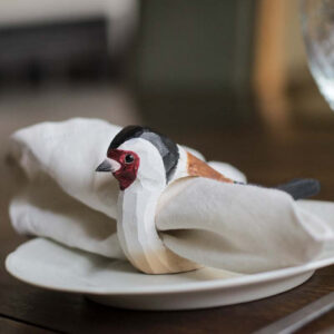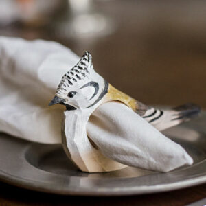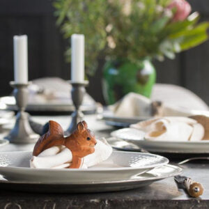 This skillful handmade napkin ring in carved linden wood is a playful table detail. Like a wild rabbit hiding from danger, its ears are set back and its expressive black glass eyes make it almost alive