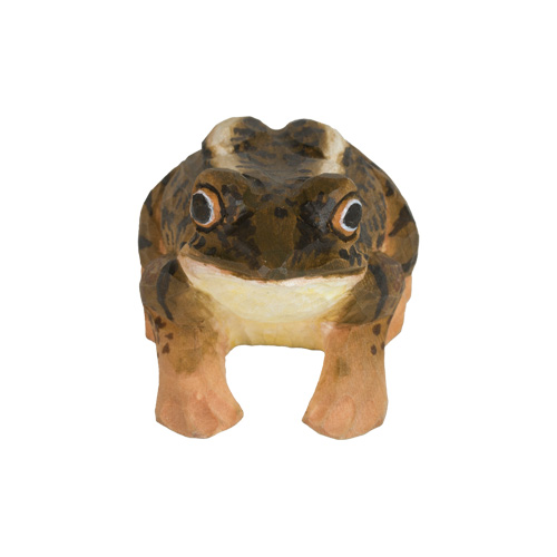 Dekorativ spidssnudet frø fra Wildlifegarden. Håndskåret i træ og håndmalet med vandbaserede farver – en naturtro og charmerende detalje til skrivebordet, vindueskarmen eller reolen.